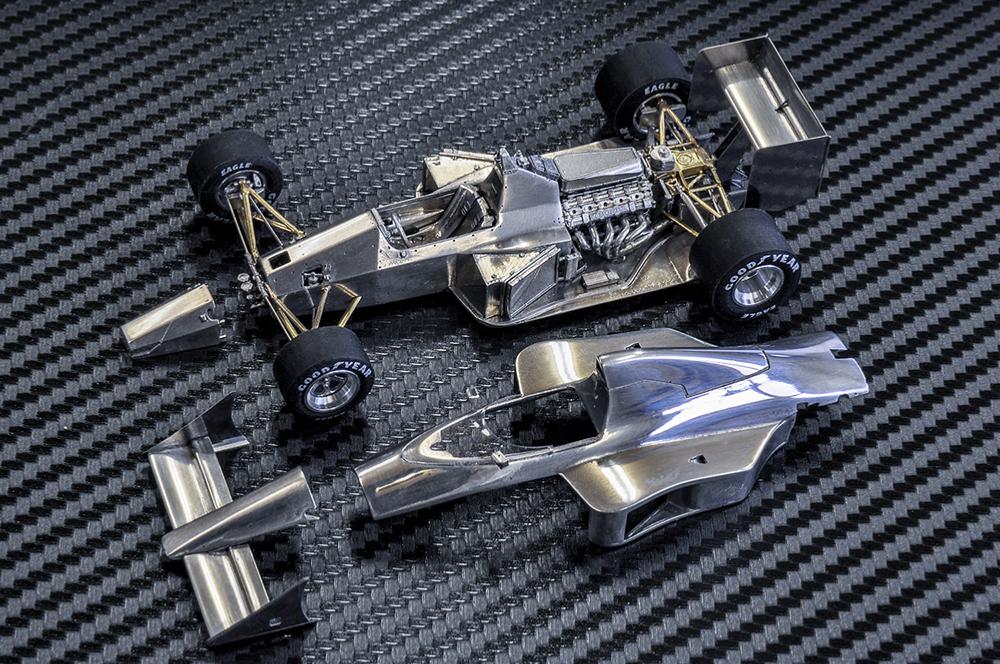 kit multi-matériaux complet et détaillé comprenant du métal blanc,  photogravure, pièces tournées en métal, pneus en caoutchouc, décals, câblages